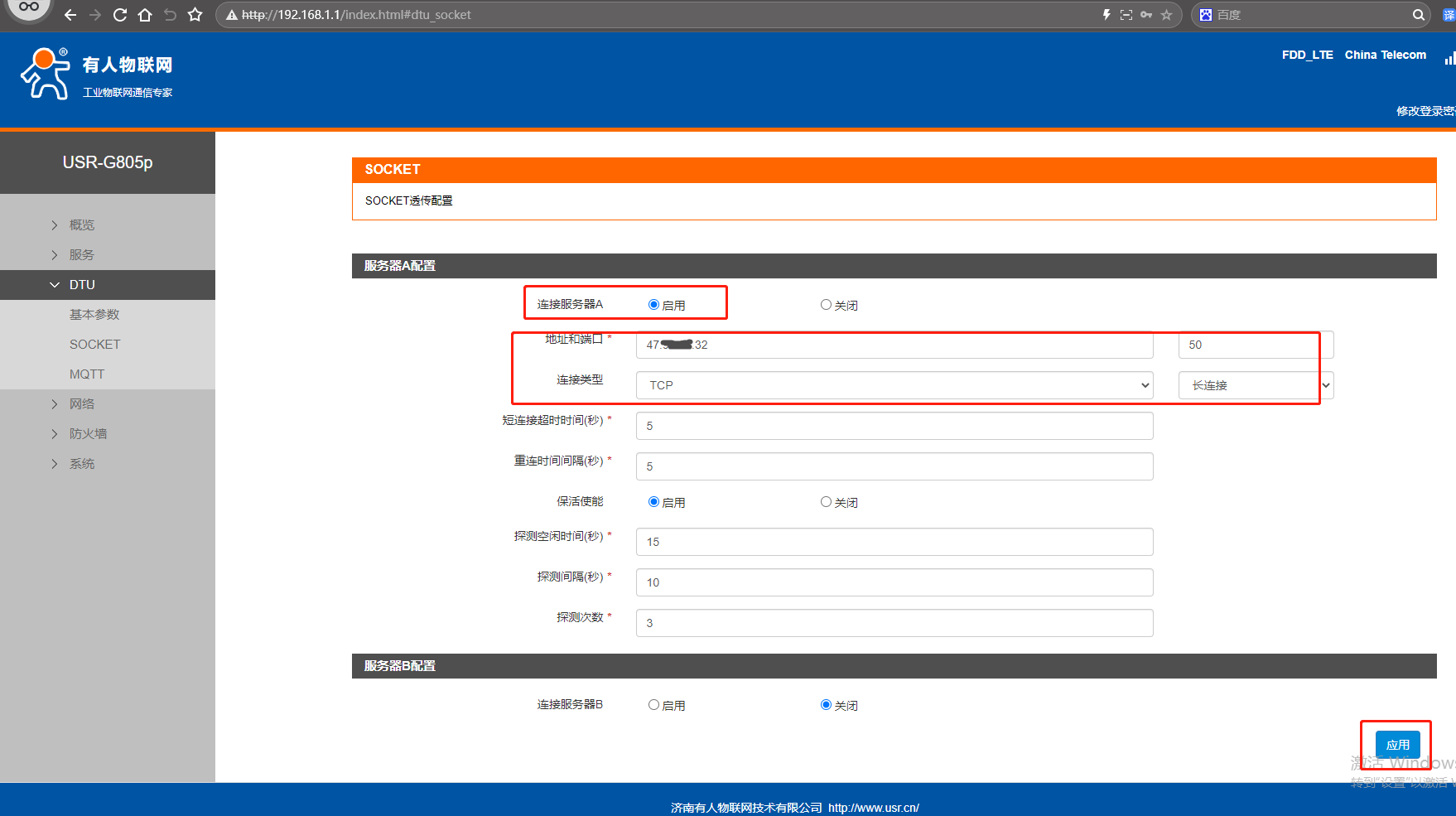 網(wǎng)頁點(diǎn)擊DTU,點(diǎn)擊SOCKET,連接服務(wù)器A,點(diǎn)擊啟用,地址填遠(yuǎn)程服務(wù)器,端口號(hào)50,連接類型TCP,長連接。點(diǎn)擊應(yīng)用。