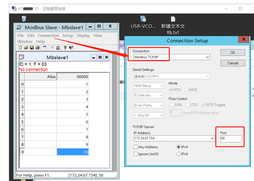 2、Modbus Slave軟件,點(diǎn)擊Connection,選擇Modbus TCP/IP,TCP/IP Server IP Address填遠(yuǎn)程服務(wù)器對應(yīng)的服務(wù)器地址IP,Port端口50。最后點(diǎn)擊OK。