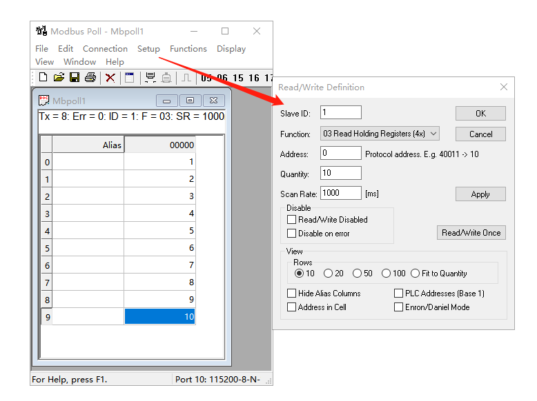 Quantity:10(從起始地址開始寄存器地址數(shù)量)