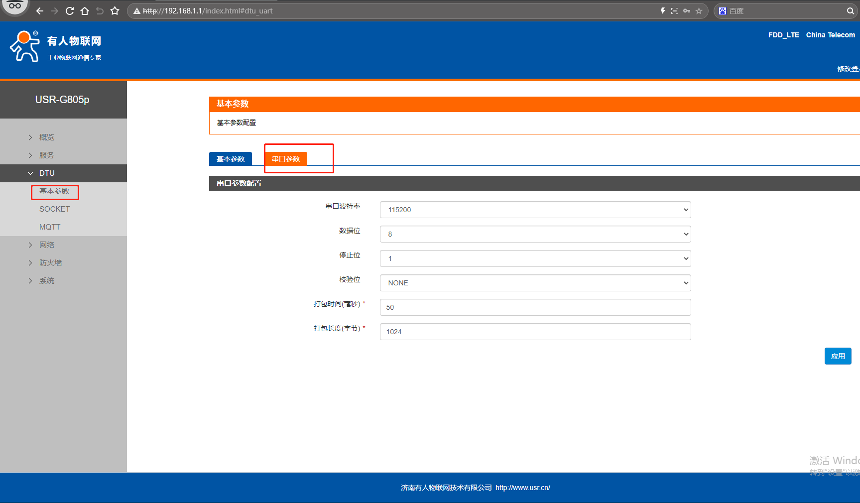 網(wǎng)頁點(diǎn)擊DTU,點(diǎn)擊基本參數(shù),串口參數(shù)保持默認(rèn),實(shí)際應(yīng)用接實(shí)際485串口設(shè)備的時(shí)候,需要和所接485串口設(shè)備的串口參數(shù)一致。點(diǎn)擊應(yīng)用。