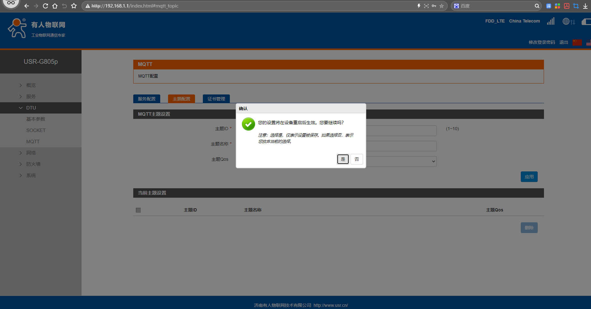 網(wǎng)頁(yè)點(diǎn)擊MQTT,點(diǎn)擊主題配置,主題ID設(shè)置1,主題名稱(chēng)/i4u4VIKvRXf/USR-G805p/user/get,主題Qos填0。點(diǎn)擊應(yīng)用。
