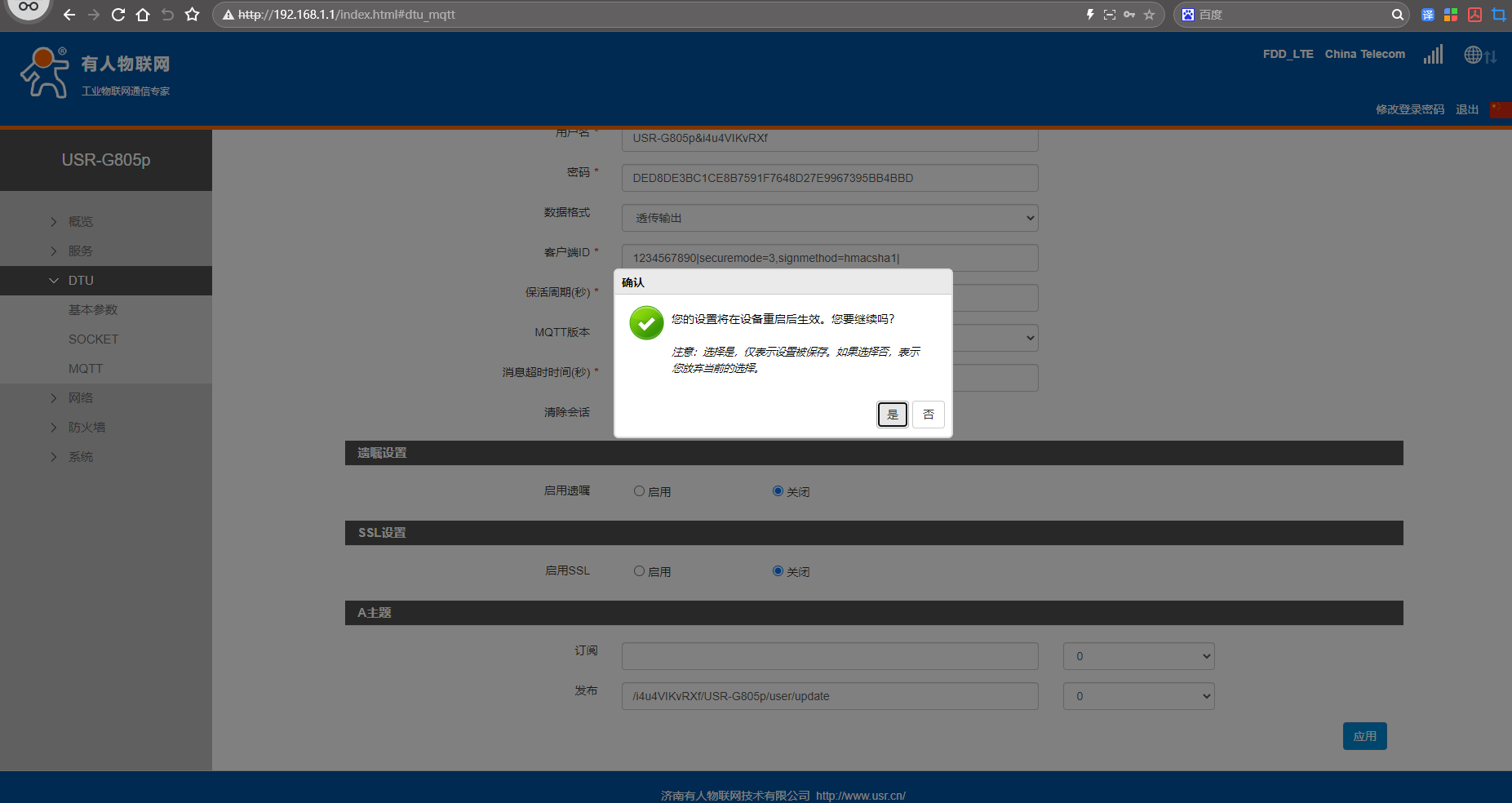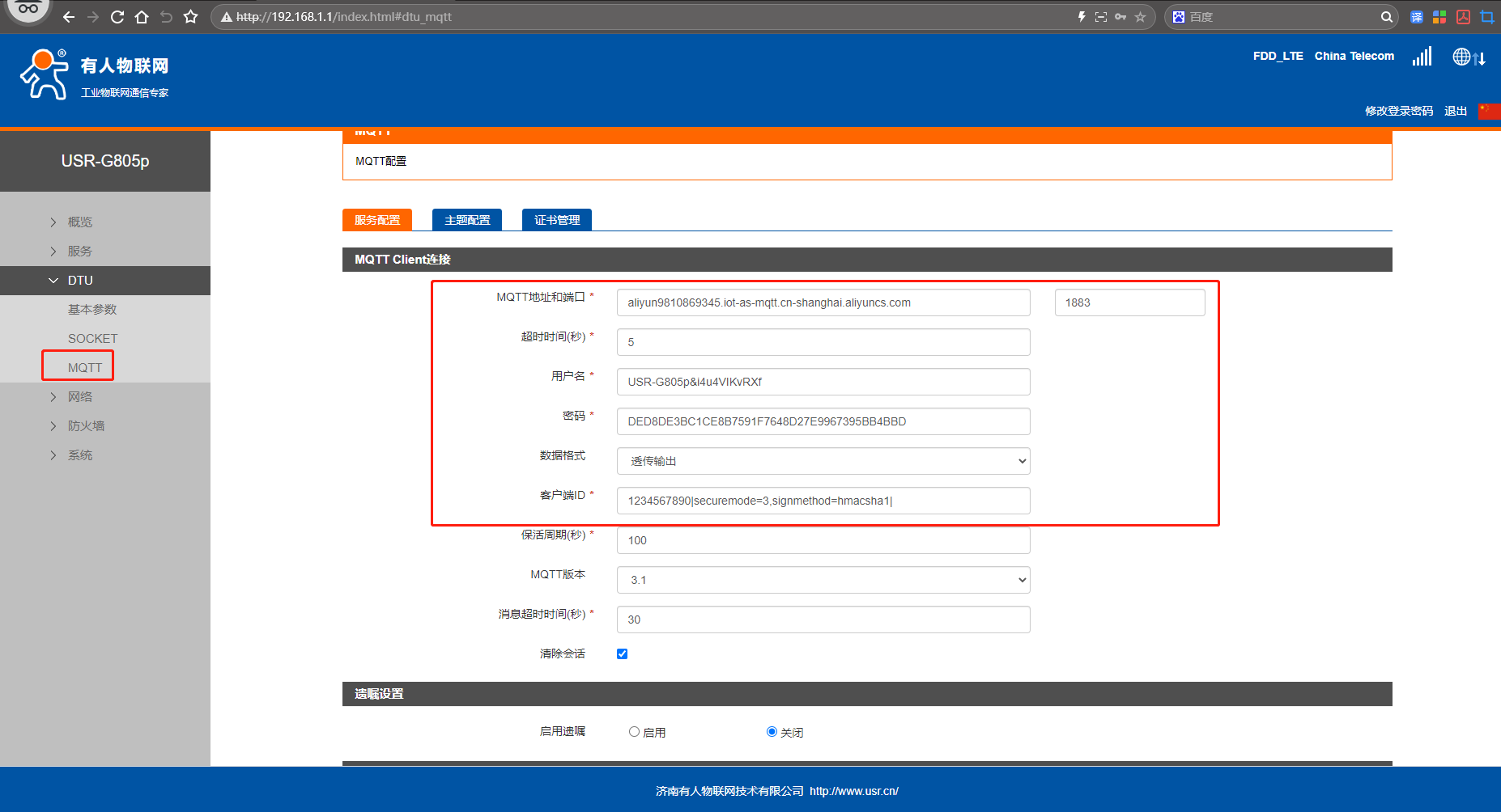 USR-G805p MQTT連接阿里云透?jìng)鬏敵鍪纠?/span>