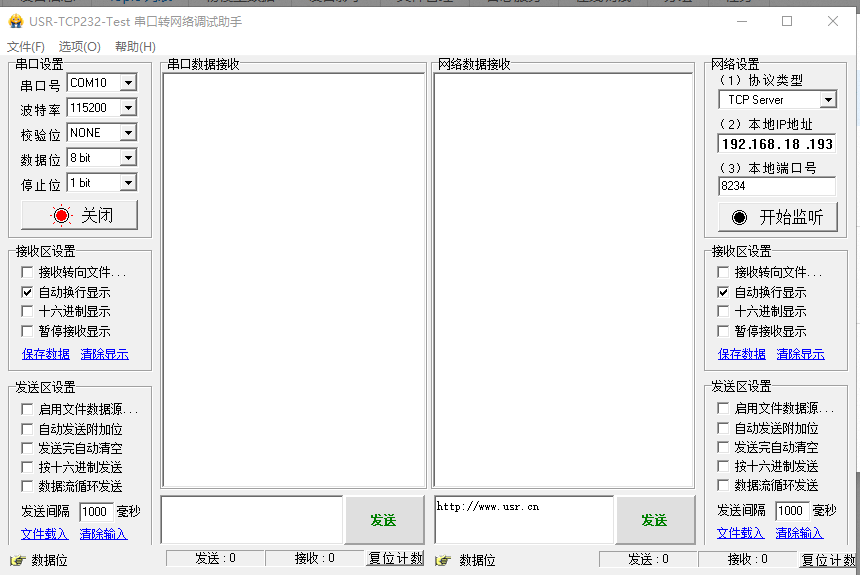 (3)打開(kāi)一個(gè)串口助手,串口參數(shù)設(shè)置和USR-G805p串口參數(shù)一致,做串口數(shù)據(jù)接收和發(fā)送。
