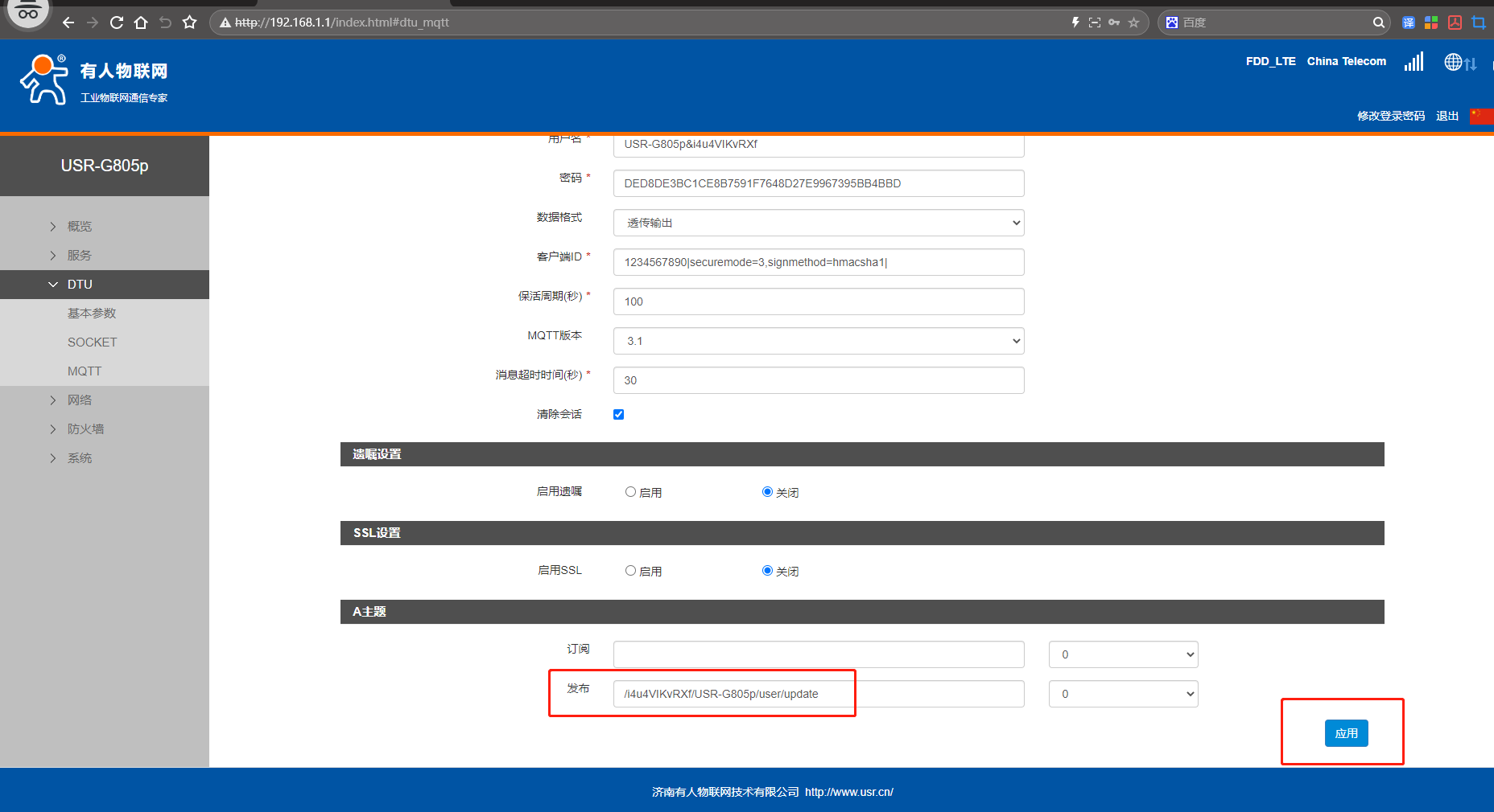 (2)A主題,發(fā)布填寫(xiě)/i4u4VIKvRXf/USR-G805p/user/update。