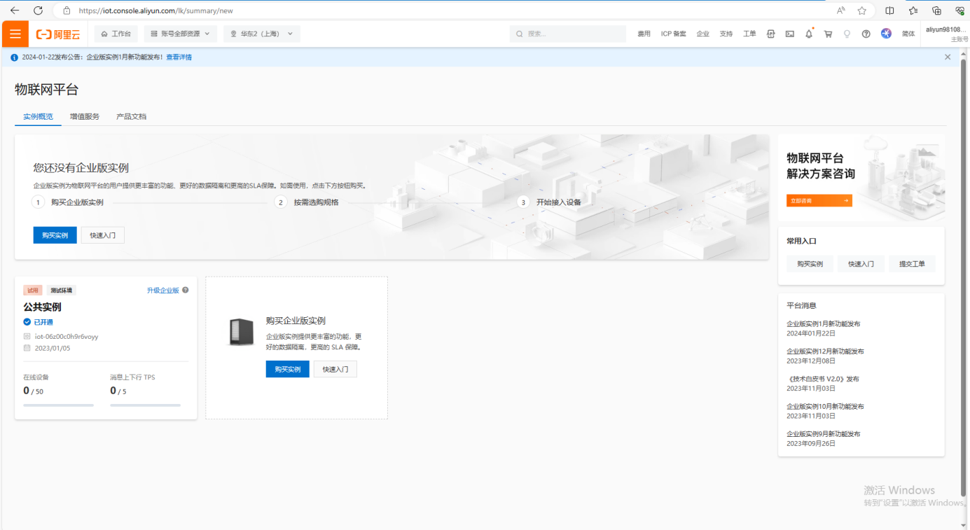 1、登陸阿里云平臺(tái),找到物聯(lián)網(wǎng)平臺(tái),這里用的連接公共實(shí)例