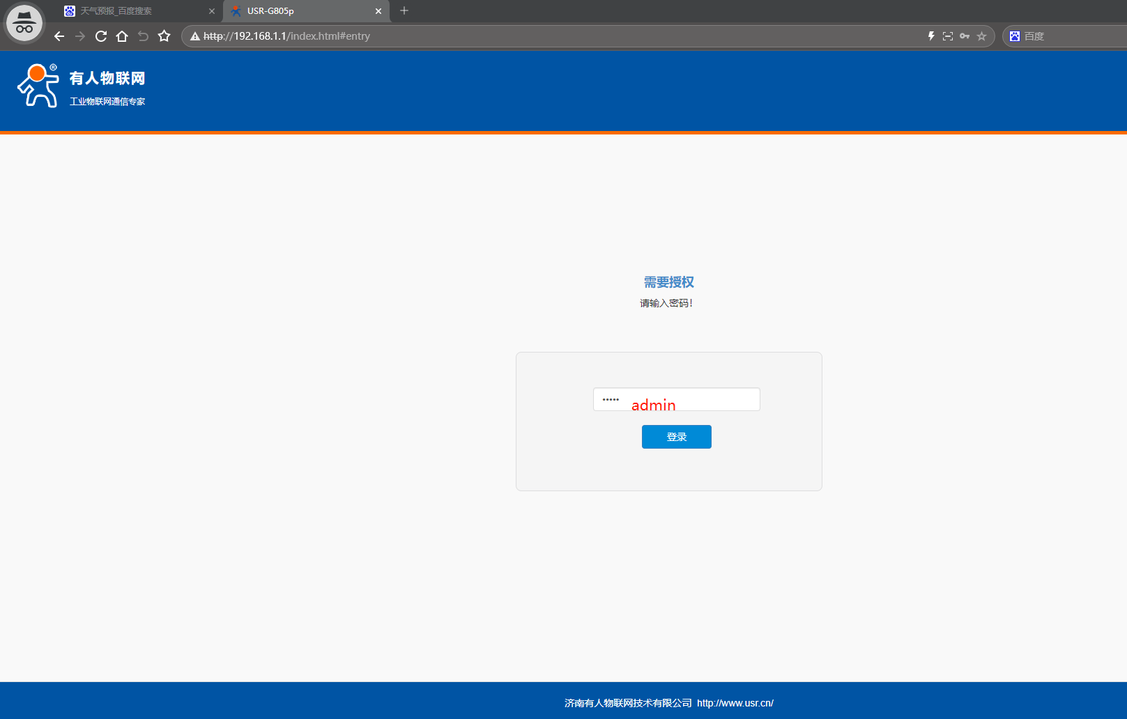 1、瀏覽器輸入192.168.1.1登陸USR-G806p網(wǎng)頁(yè),密碼是admin。