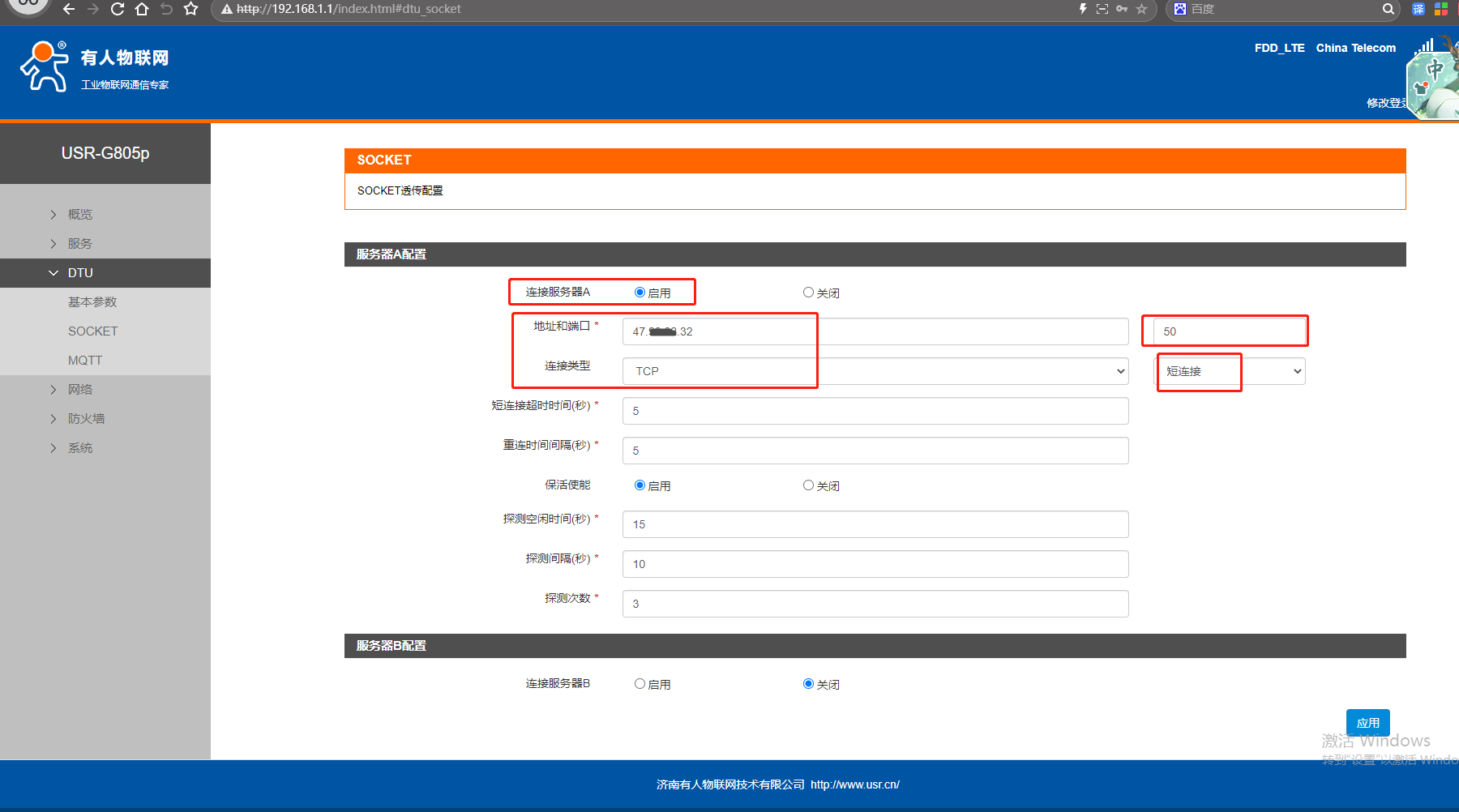 網(wǎng)頁(yè)點(diǎn)擊DTU,點(diǎn)擊SOCKET,連接服務(wù)器A,點(diǎn)擊啟用,地址填遠(yuǎn)程服務(wù)器,端口號(hào)50,連接類型TCP,短連接。點(diǎn)擊應(yīng)用。