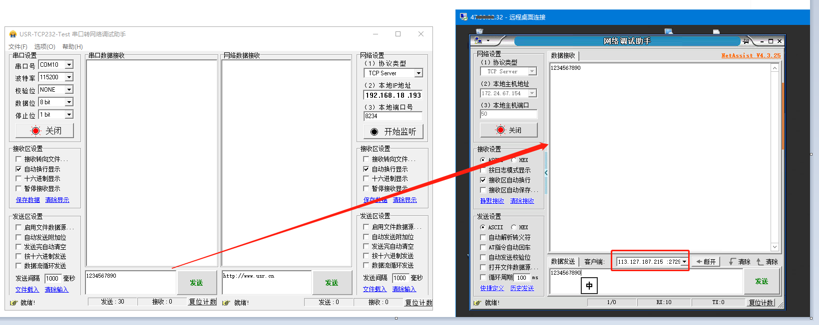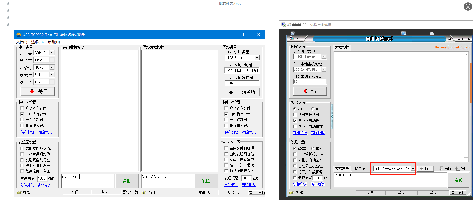2、打開(kāi)串口助手,選擇USB-RS485串口線的COM口號(hào),串口參數(shù)和USR-G805p一致。測(cè)試串口向服務(wù)器網(wǎng)絡(luò)發(fā)送數(shù)據(jù),遠(yuǎn)程桌面TCP連接建立,串口再發(fā)數(shù)據(jù),服務(wù)器接收到數(shù)據(jù)。不發(fā)送數(shù)據(jù),TCP連接會(huì)斷開(kāi),這就是短連接。