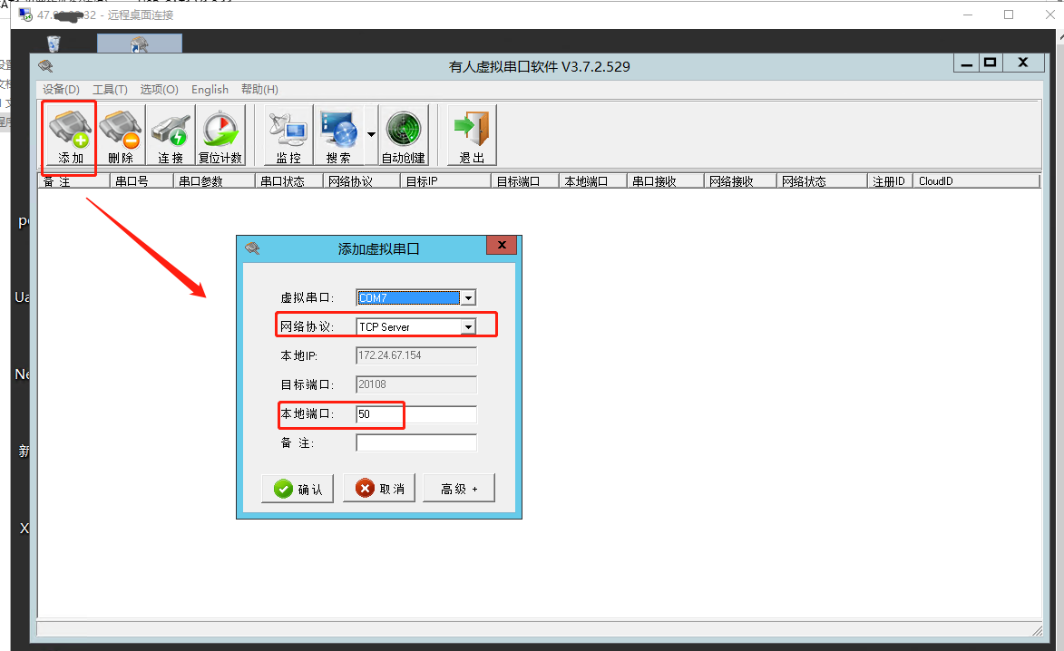 1、遠(yuǎn)程服務(wù)器端,登錄遠(yuǎn)程桌面,打開虛擬串口軟件,虛擬串口選擇一個(gè)COM口,舉例COM7,網(wǎng)絡(luò)協(xié)議做TCP server,本地端口50,點(diǎn)擊確認(rèn)。