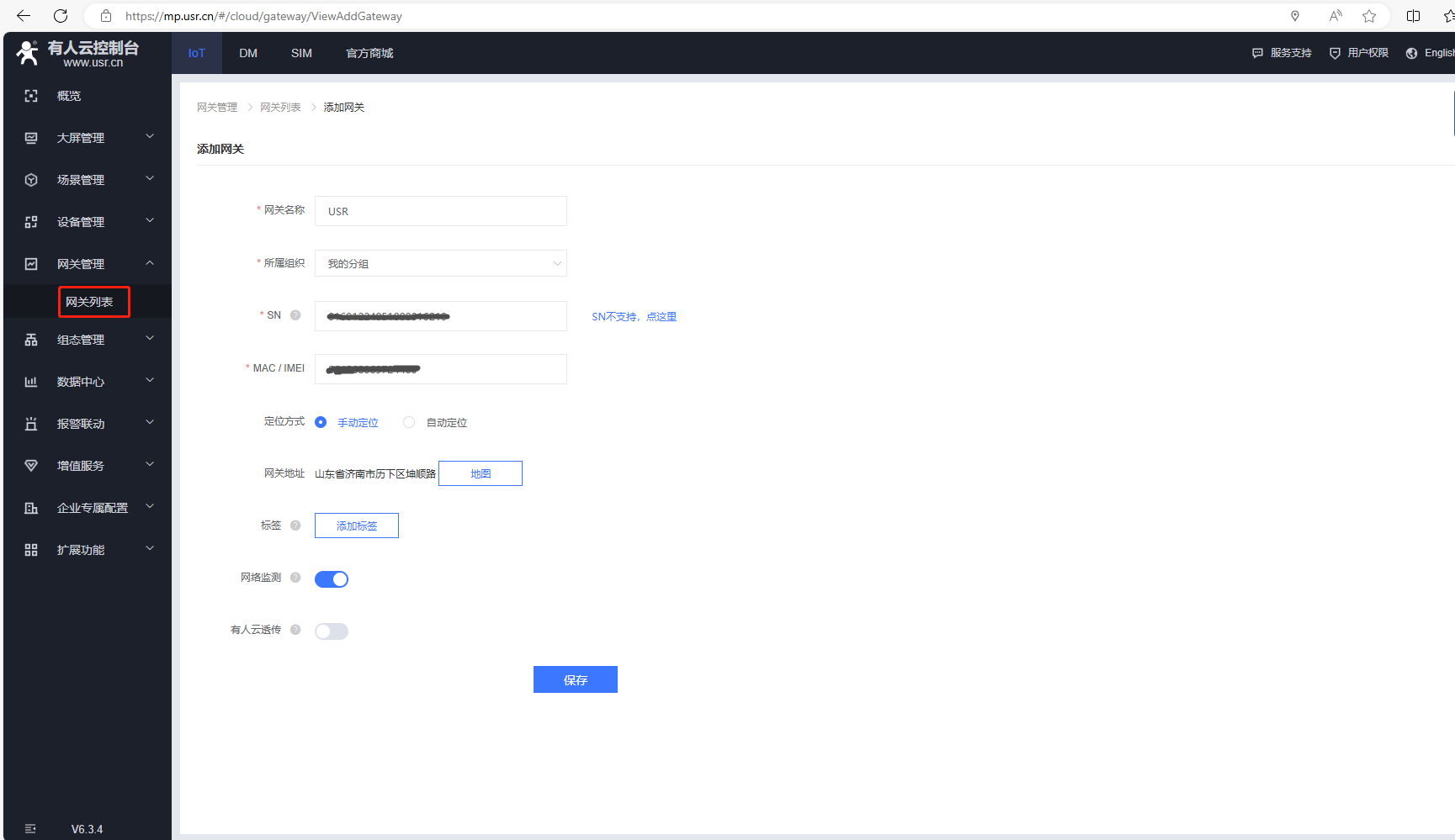 (2)支持SN上云的路由器產(chǎn)品,可以用產(chǎn)品標(biāo)簽上的SN和IMEI,添加網(wǎng)關(guān),點(diǎn)擊保存。