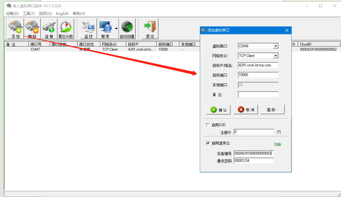 下載虛擬串口軟件,在虛擬串口軟件中把系統(tǒng)分配的SN和通訊密碼進行配置。