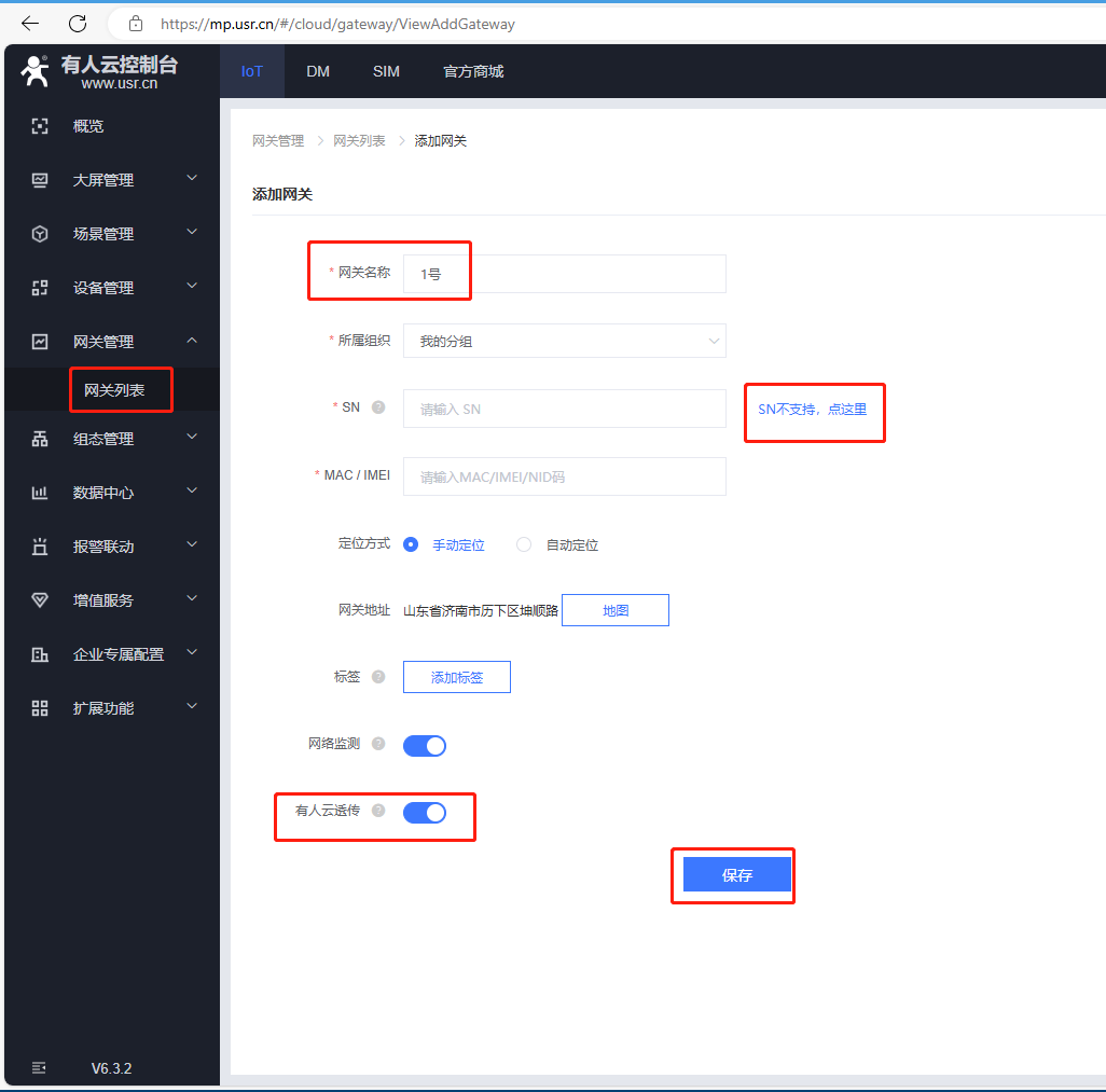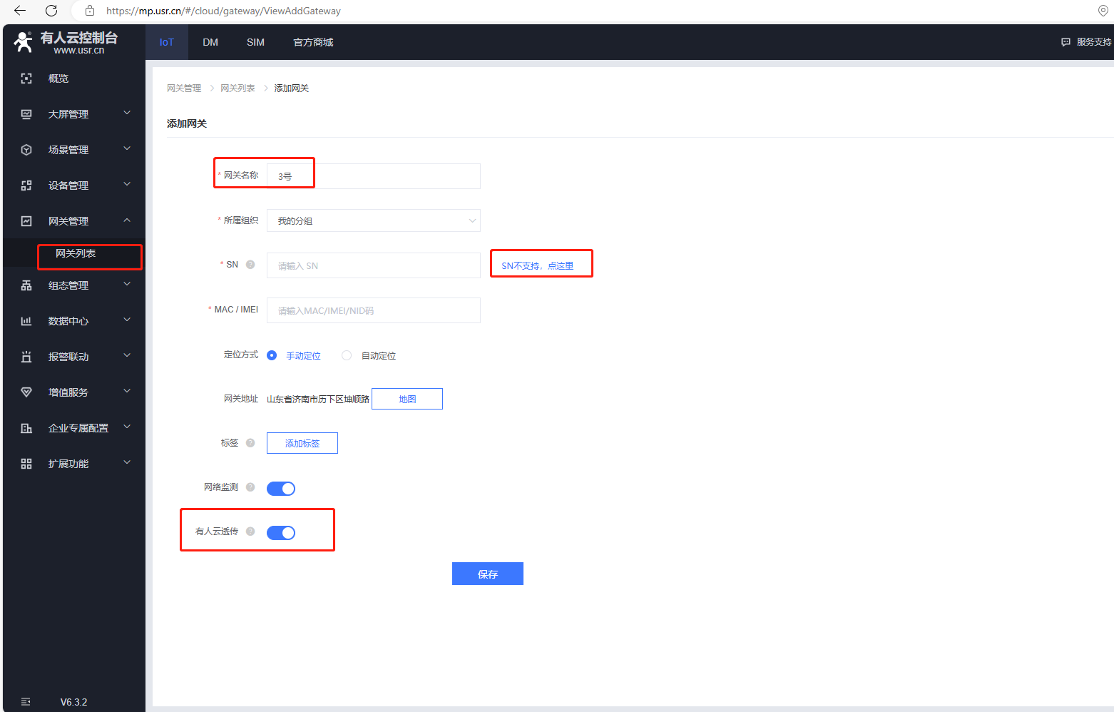 2、USR-VCOM虛擬串口添加,點擊SN不支持,點這里,用自動生成的ID方式上云,在有人云上添加設備,勾選有人云透傳。
