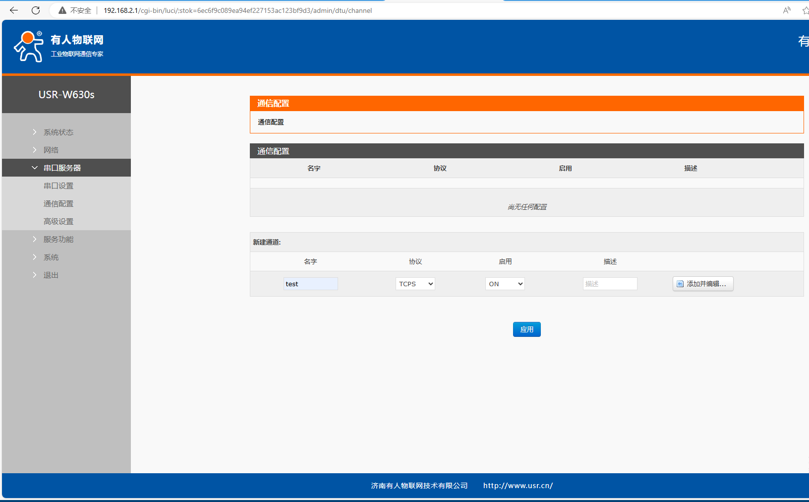 (5)串口服務(wù)器,通信配置,協(xié)議TCPS,應(yīng)用ON,點(diǎn)擊添加并編輯。
