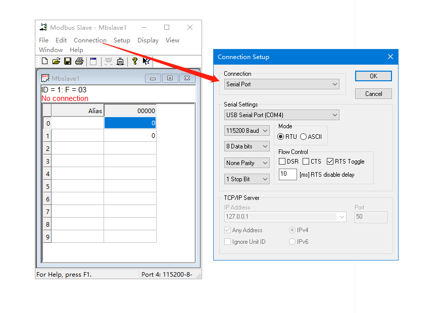 2、打開MODBUS SLAVE軟件,點(diǎn)擊Connection,選擇USR-W630s的USB-RS232串口線COM口號(hào)COM4,打開串口,MODBUS SLAVE軟件的串口參數(shù)設(shè)置和USR-W630s的串口參數(shù)一致。點(diǎn)擊OK。