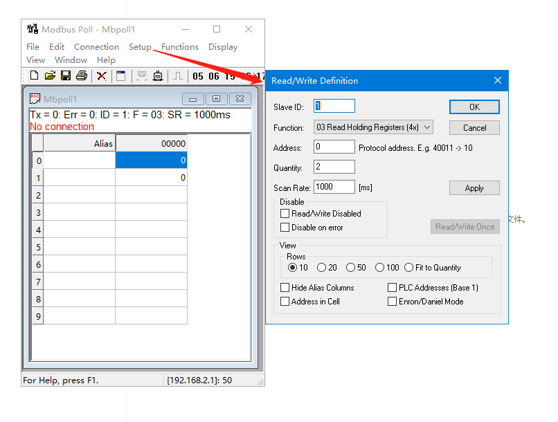 3、打開MODBUS POLL軟件,點(diǎn)擊Setup,從機(jī)地址Slave ID 用1,寄存器功能碼Function 用03,寄存器起始地址Address 用0,寄存器數(shù)量Quantity 用2。采集頻率Scan Rate 用1000ms。