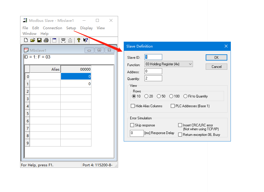1、打開MODBUS SLAVE軟件,點(diǎn)擊Setup,從機(jī)地址Slave ID 用1,寄存器功能碼Function 用03,寄存器起始地址Address 用0,寄存器數(shù)量Quantity 用2。