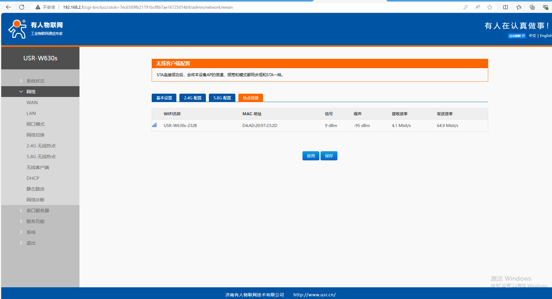 3、USR-W630s STA網(wǎng)頁(yè),無線客戶端,熱點(diǎn)信息可以查看無線連接狀態(tài),連接AP之后,顯示AP熱點(diǎn)信息。