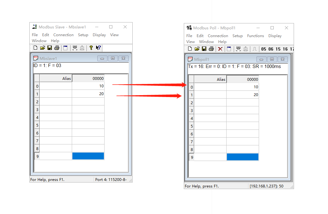 4、建立連接之后,改變MODBUS SLAVE的數(shù)據(jù),MODBUS POLL對(duì)應(yīng)讀取出數(shù)據(jù)。