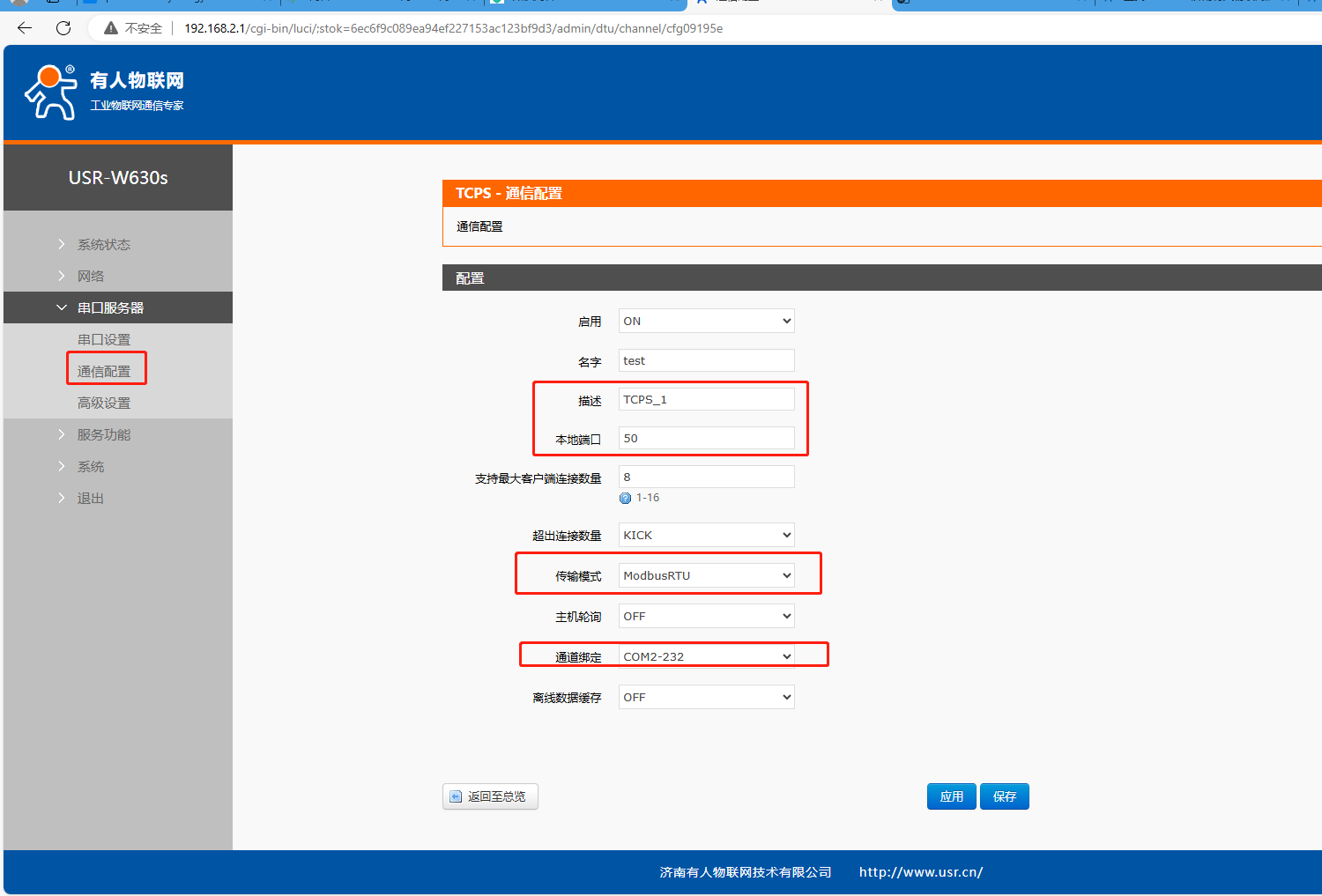 本地端口:50,傳輸模式:ModbusRTU,通道綁定:COM2-232。