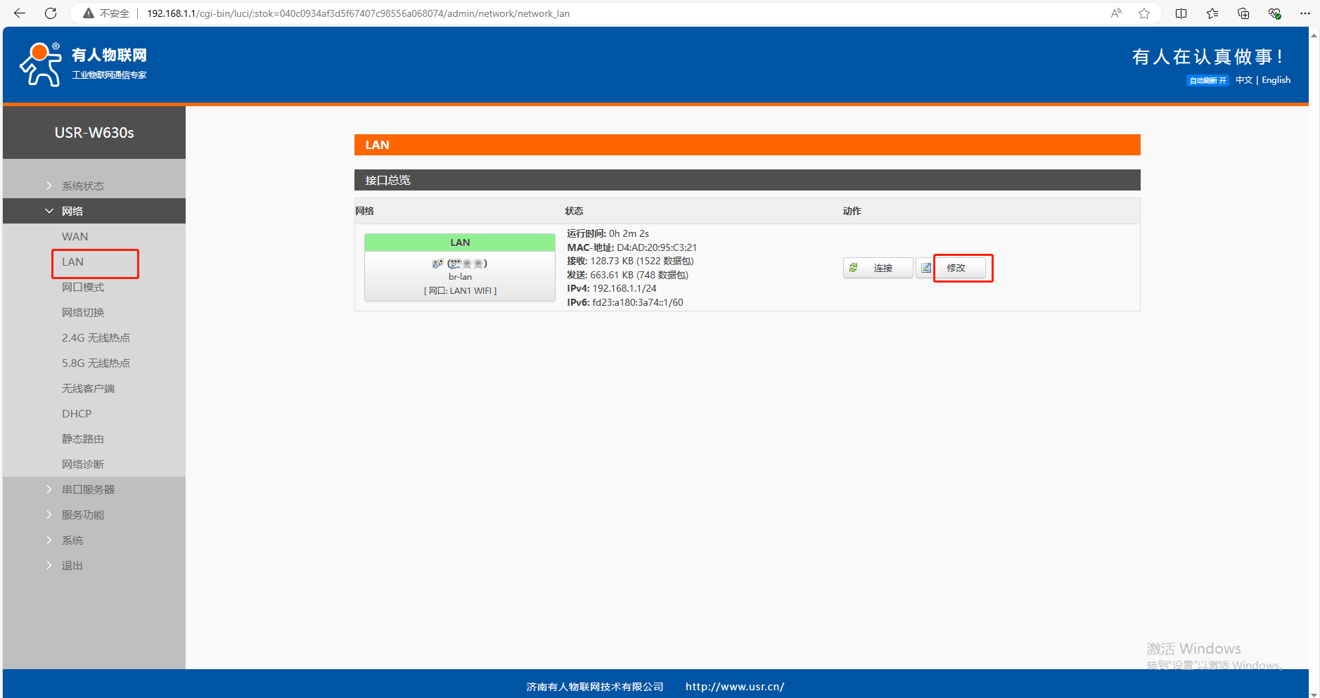 (6)網(wǎng)絡(luò),LAN,點(diǎn)擊修改,IPv4地址192.168.1.1,要改為和做AP的USR-W630s不一樣的網(wǎng)段IP。這里改為192.168.2.1,點(diǎn)擊應(yīng)用。