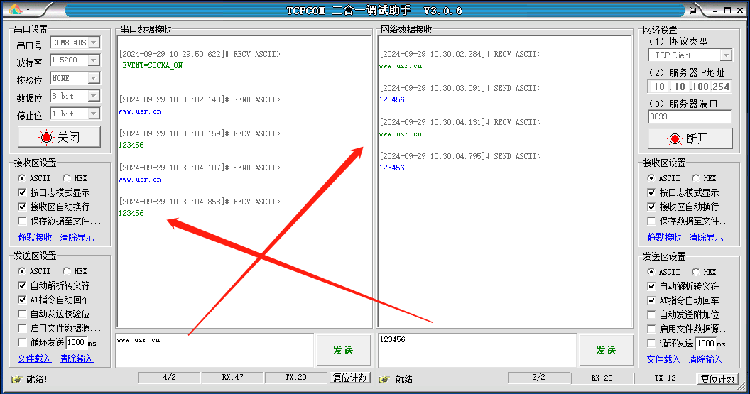 打開一個(gè)串口調(diào)試助手,引用USB轉(zhuǎn)換器COM4,和網(wǎng)絡(luò)調(diào)試助手進(jìn)行數(shù)據(jù)互發(fā)測(cè)試。