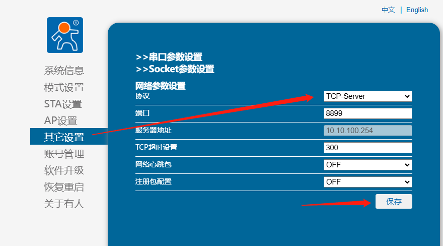 “其他設(shè)置”界面中配置模塊為tcp server模式,端口8899,保存,重啟。