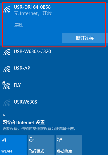 USR-DR164插上WIFI天線,接上12V電源,電腦右下角搜索USR-DR164的WIFI ,WiFi名字 USR-DR404_xxxx(xxxx 是 DR164 MAC 的后四 位 ),點(diǎn)擊鏈接WIFI。