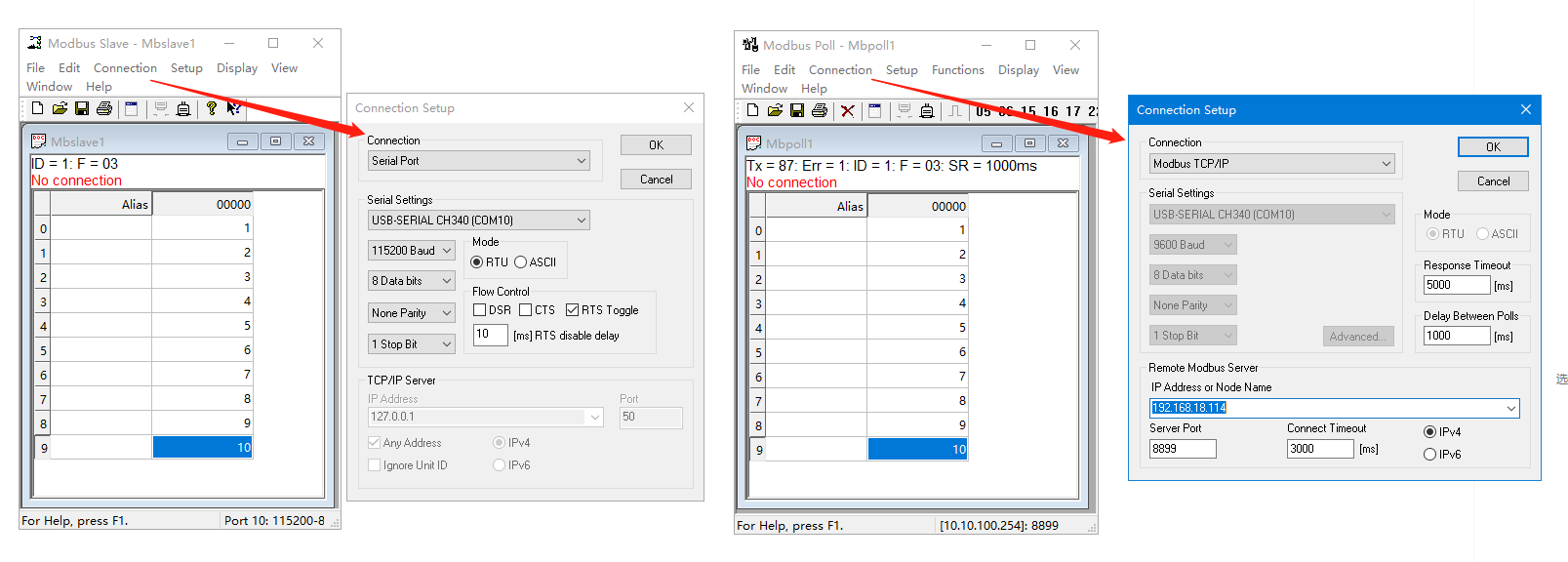 2、打開MODBUS SLAVE和MODBUS POLL軟件,MODBUS SLAVE的Connection選擇串口COM10,串口參數(shù)設置和DR164一致。MODBUS POLL的Connection選擇Modbus TCP/IP,IP地址填192.168.18.114,端口填8899。