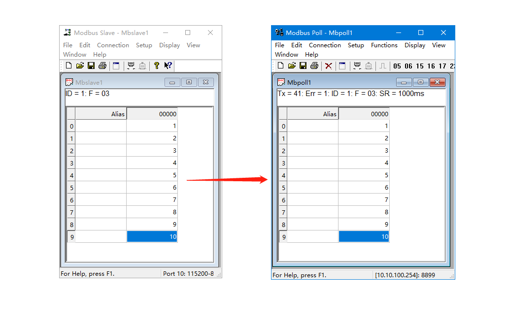 MODBUS SLAVE軟件改變數(shù)據(jù),對應MODBUS POLL軟件采集到數(shù)據(jù)。