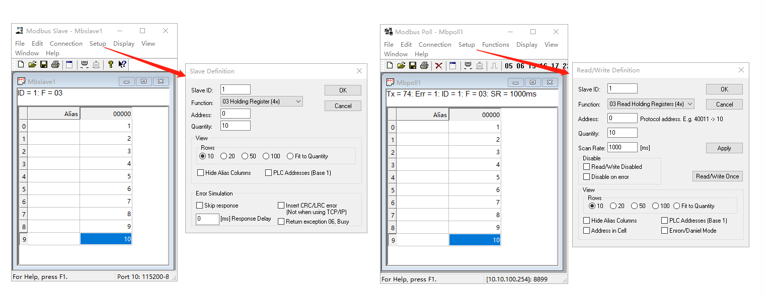 1、打開MODBUS SLAVE和MODBUS POLL軟件,Setup設置一樣,Slave ID 用1,F(xiàn)unction 03功能碼,Address寄存器起始地址0,Quantity寄存器數(shù)量10。