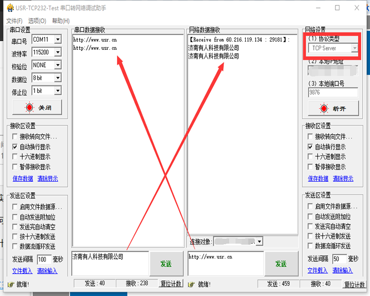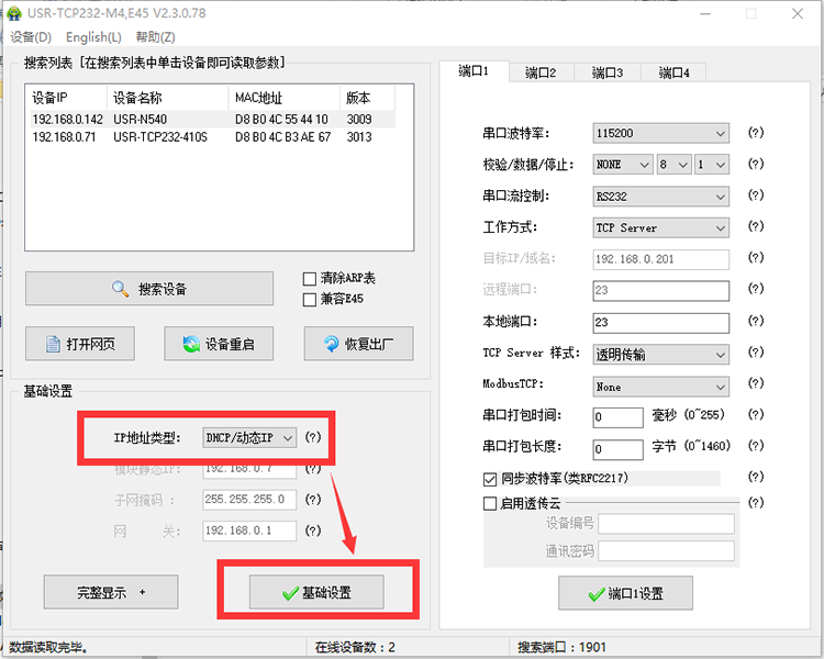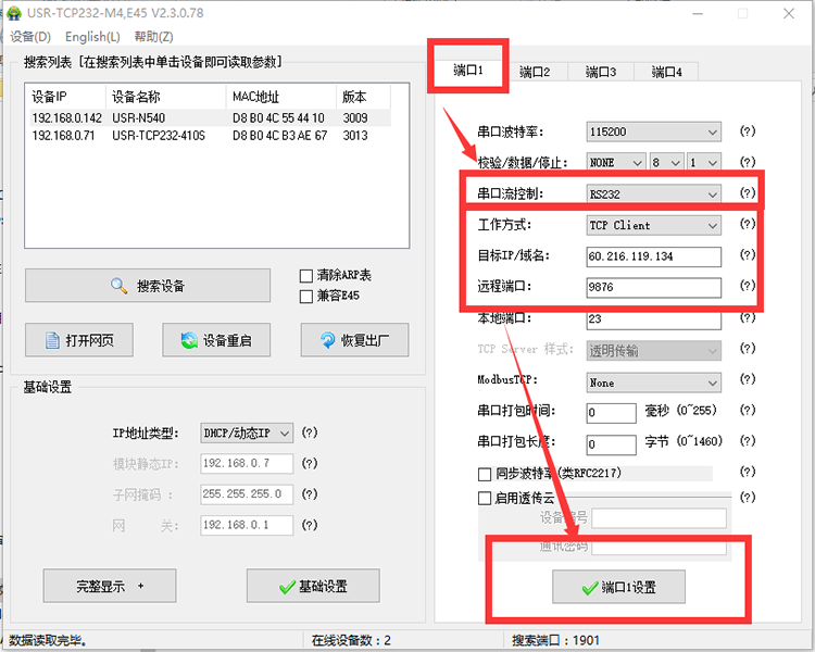 5、打開參數(shù)設(shè)置軟件USR-TCP232-M4,E45-V2.3.0.78.exe ,點擊“搜索設(shè)備”,點擊搜索到的模塊IP,選擇實際使用的端口 號,此處以端口一,RS232串口舉例,配置參數(shù)如圖,點擊“端口1設(shè)置”