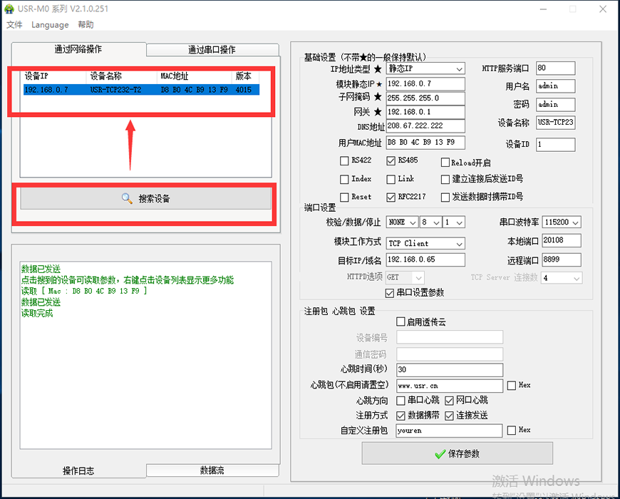 5、打開(kāi)參數(shù)設(shè)置軟件USR-TCP232-M0-V2.1.0.251.exe ,點(diǎn)擊“搜索設(shè)備”,點(diǎn)擊搜索到的模塊IP,選擇是通過(guò)RS485串口還是RS232串口進(jìn)行通信,此處以RS232串口舉例,配置參數(shù)如圖,點(diǎn)擊“保存參數(shù)”