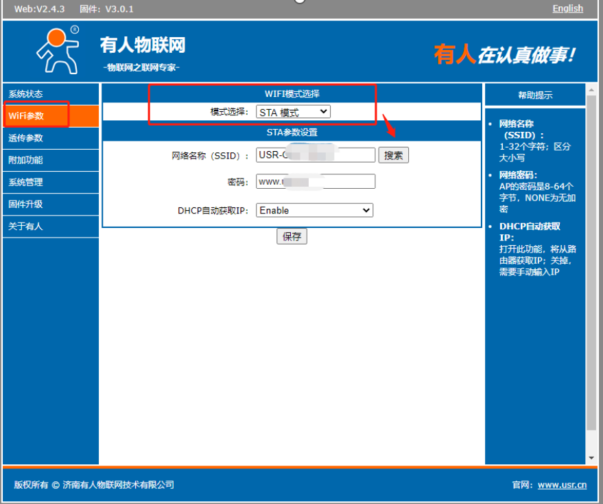 4.在WIFI參數(shù)里面選擇STA模式,搜索現(xiàn)場2.4Gwifi(密碼不可以有中文特殊字符)點擊保存,暫時不重啟