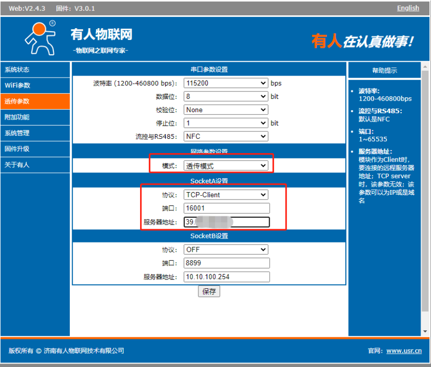 5.在透傳參數(shù)設置模式--透傳模式,SocketA設置為TCP clinet