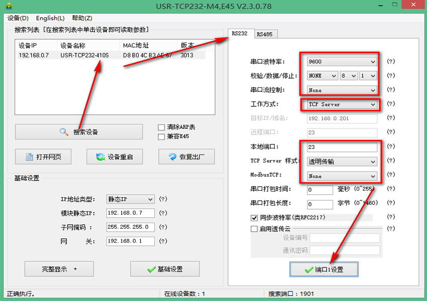一、將串口服務(wù)器網(wǎng)口直連電腦網(wǎng)口或者連接路由器網(wǎng)口。使用設(shè)置軟件設(shè)置參數(shù):搜索設(shè)備,設(shè)置串口服務(wù)器的IP地址與局域網(wǎng)網(wǎng)段一致,設(shè)置串口服務(wù)器的波特率為9600,校驗(yàn)數(shù)據(jù)位停止位:NONE 8 1。這個(gè)參數(shù)要和PLC的參數(shù)一致,然后點(diǎn)擊端口1設(shè)置。