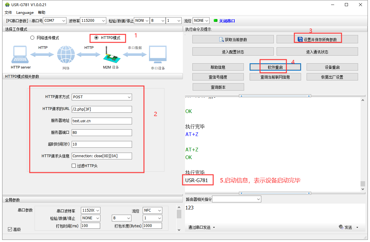 5>待重啟完畢后會(huì)在串口打印USR-G781字樣,表示設(shè)備啟動(dòng)完成。
