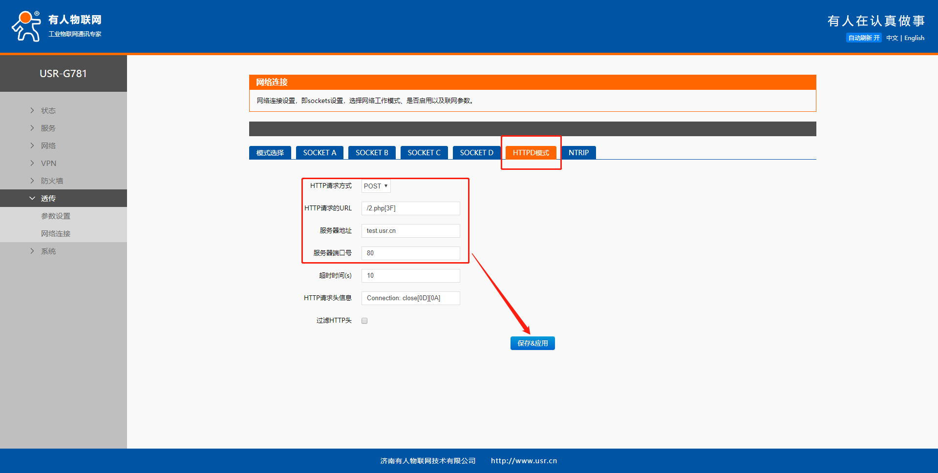 1>設(shè)置工作模式為HTTPD模式,保存并應(yīng)用。