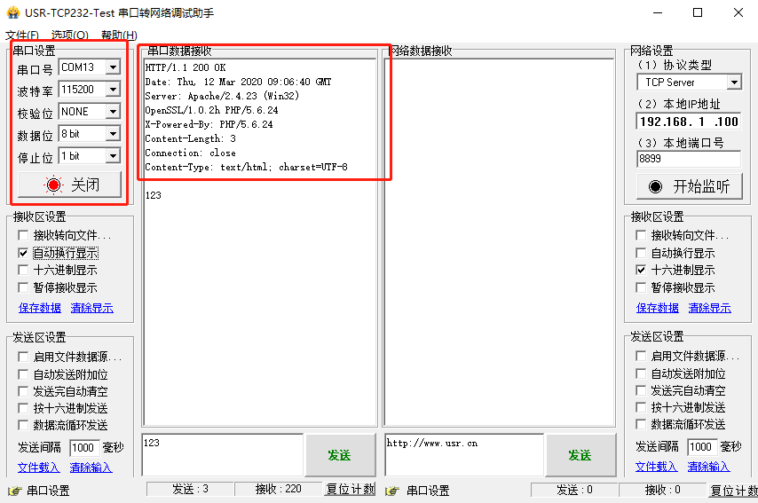 在發(fā)送區(qū)填寫數(shù)據(jù),點(diǎn)擊發(fā)送,則可在接收區(qū)域接收到服務(wù)器的返回,其中HTTP頭信息可以設(shè)置過濾掉。