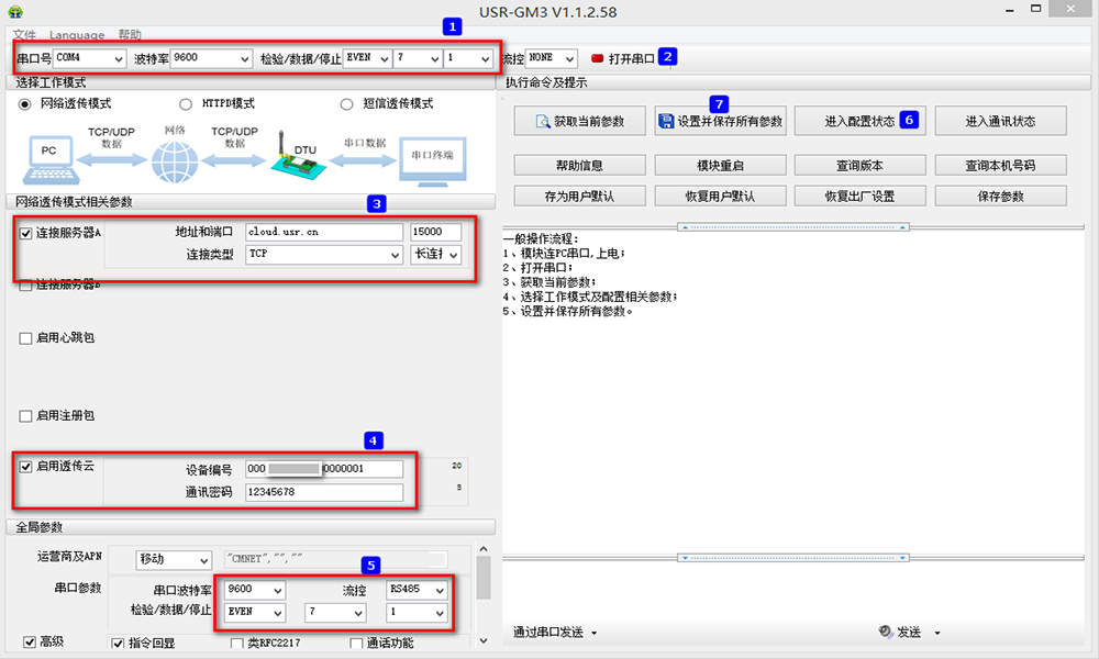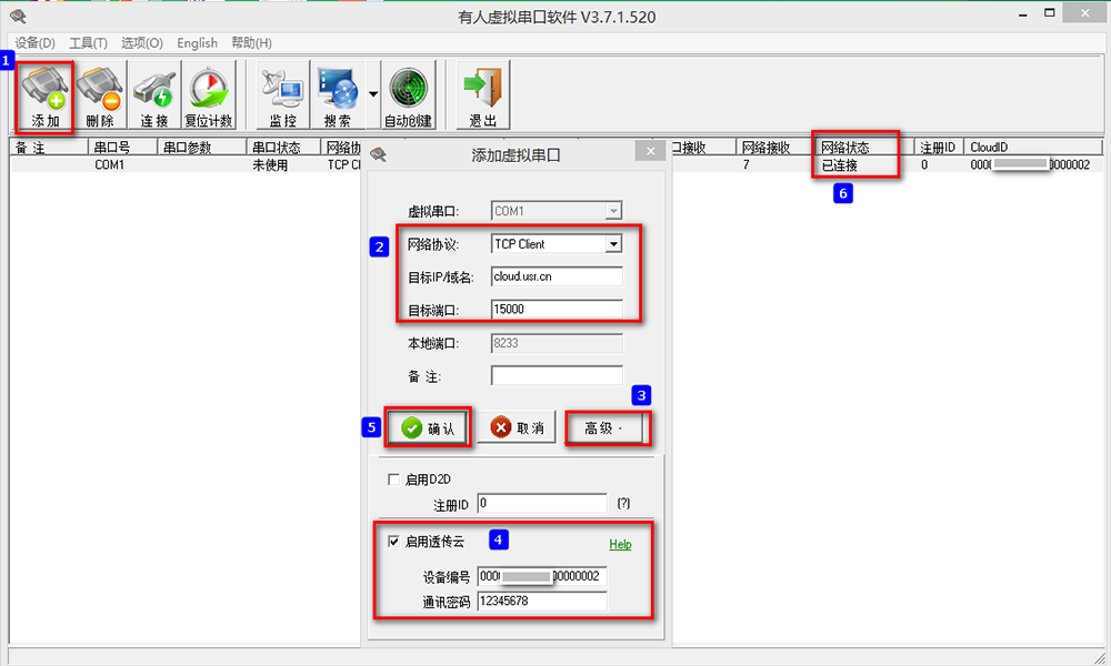 三、勾選啟用透傳云,填寫設(shè)備編號及密碼