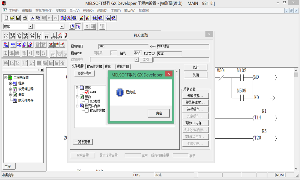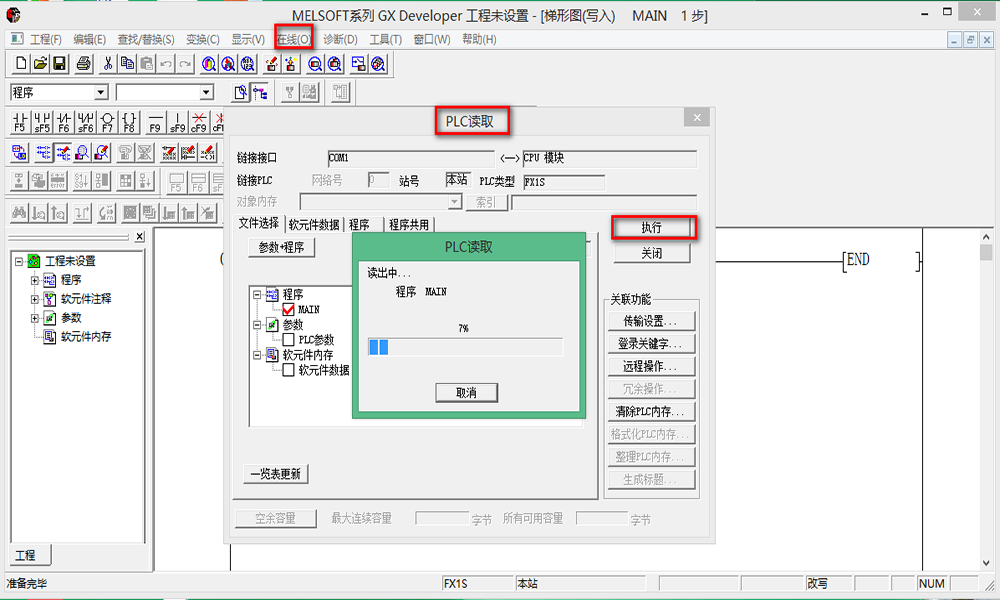 十二、退出此界面,點擊“在線-PLC讀取”,點擊“執(zhí)行”,會顯示下載進(jìn)度
