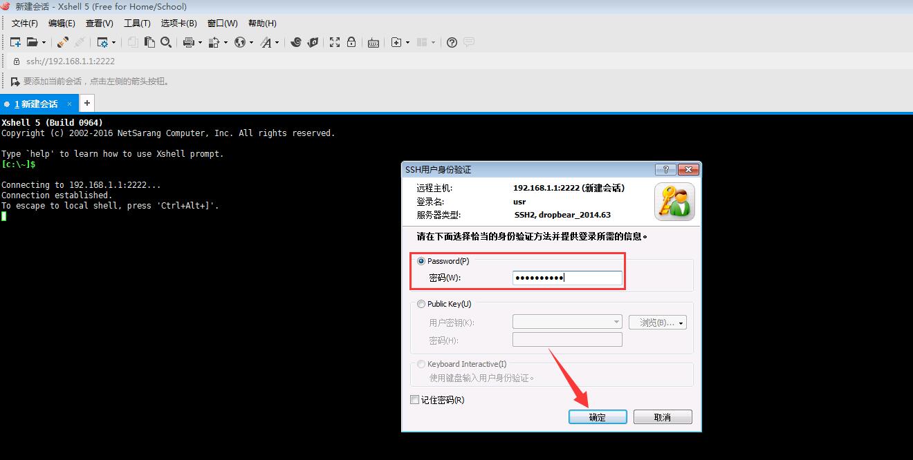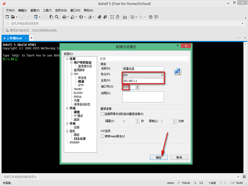 6、協議選為ssh 主機填寫192.168.1.1 端口號填寫2222,點擊“確定”
