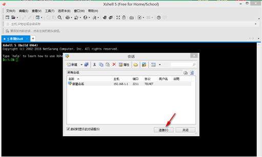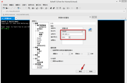 6、協(xié)議選為ssh 主機填寫192.168.1.1 端口號填寫2211,點擊“確定”,協(xié)議選為TELNET