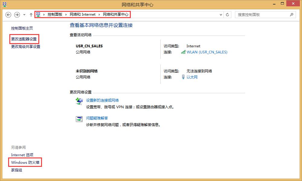 2.按路徑:控制面板》網(wǎng)絡(luò)和Internet》網(wǎng)絡(luò)和共享中心找到“windows防火墻”和“更改適配器設(shè)置”選項(xiàng),關(guān)閉防火墻并禁用與本次測(cè)試無(wú)關(guān)的網(wǎng)卡。并關(guān)閉電腦殺毒軟件。