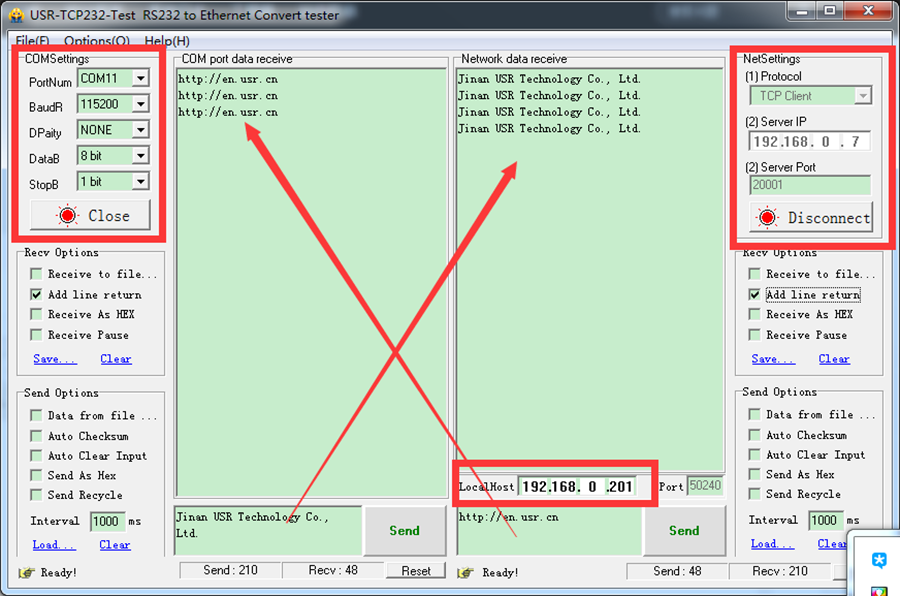 將軟件串口設(shè)置中的串口號(hào)配置為COM11。由于設(shè)備默認(rèn)協(xié)議類型為TCP server,所以電腦端連接設(shè)備需要設(shè)置為TCP client連接設(shè)備的server。服務(wù)器IP設(shè)置為設(shè)備IP:192.168.0.7,端口號(hào)20001(第一個(gè)串口)。