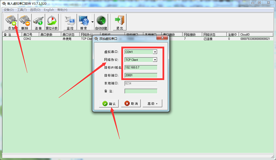 七、打開虛擬串口軟件,點(diǎn)擊“添加”在彈出的窗口中設(shè)置虛擬串口信息,由于上述N668設(shè)備采用TCP server協(xié)議,所以此處網(wǎng)絡(luò)協(xié)議設(shè)置為TCP client。目標(biāo)IP和目標(biāo)端口設(shè)置為N6680的IP和端口。然后點(diǎn)擊“確定”,建立虛擬串口COM1。