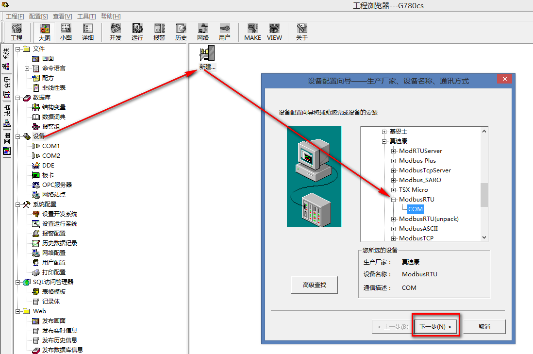 4.3點擊設備,新建一個組態(tài)設備,選擇 PLC-莫迪康-Modbus RTU-COM,點擊“下一步”