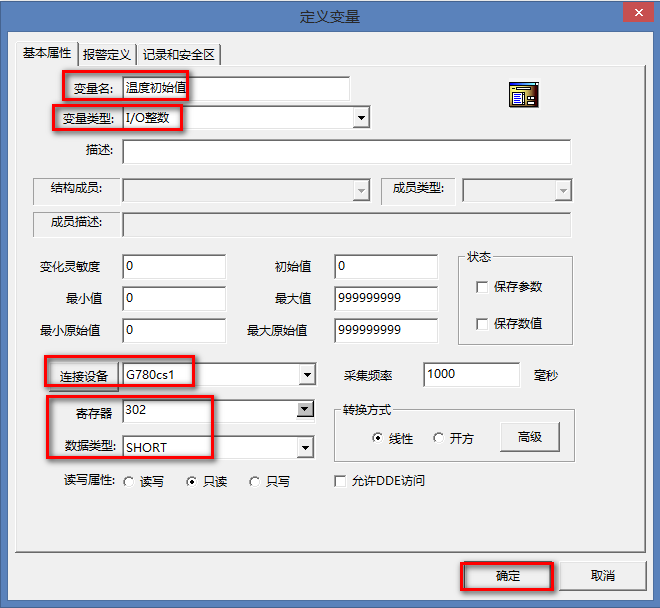 (2)新建變量:溫度初始值,選擇變量類型:IO 整數(shù),連接設備為新建的設備名:G780cs1,寄存器302,代表功能碼為04,起始地址0的第二個值。