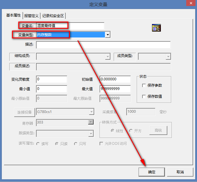 (1)新建變量名:濕度初始值,選擇變量類型:IO整數(shù),連接設備為新建的設備名:G780cs1,寄存器301,代表功能碼為04,起始地址0的第一個值。