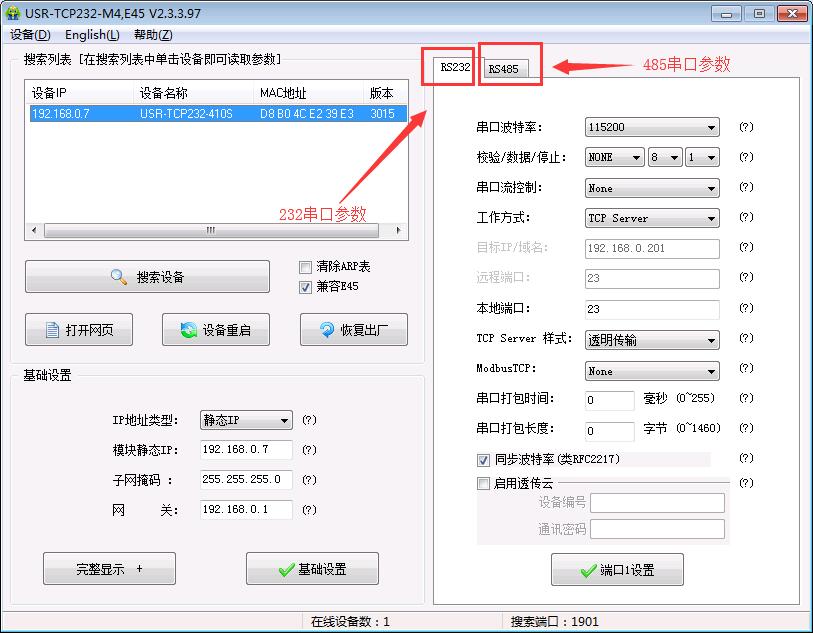 4. 打開設置軟件,點擊“搜索設備”當搜索列表中出現(xiàn)410的設備后,單擊搜索到的設備,查看其配置信息(上圖為默認配置信息)。