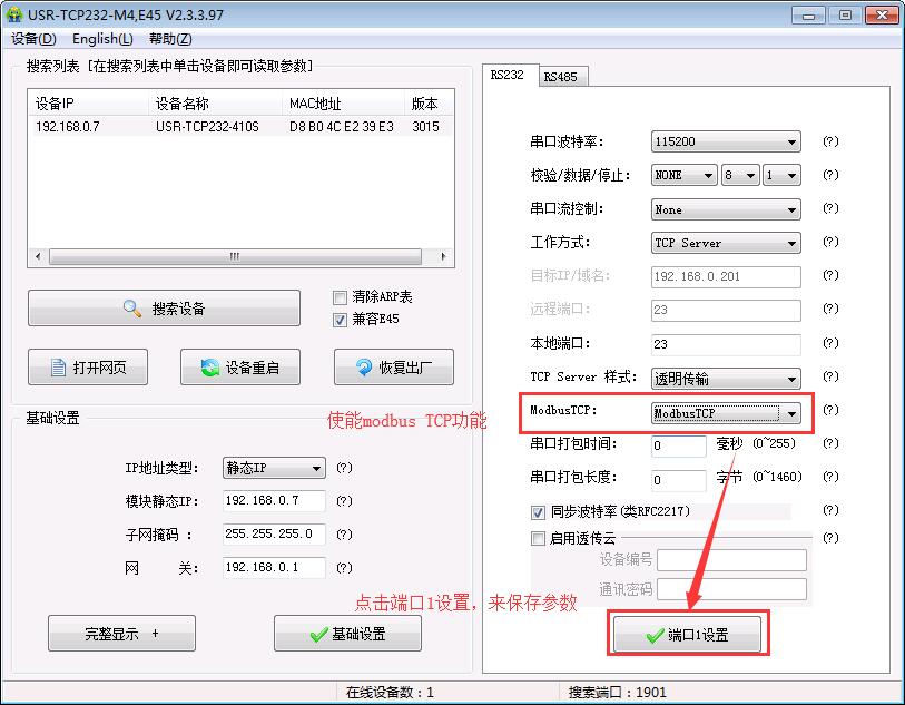 5. 下圖中使能modbus TCP功能,設置完成后,重新搜索一次,確認參數(shù)是否修改成功